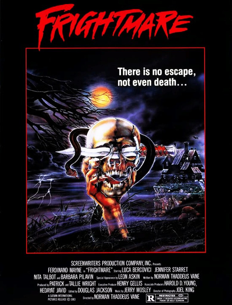 Ingeniosa y entretenida historia de horror sobre un actor mítico de películas de miedo (muy al estilo de Christopher Lee o similares) que resulta ser una persona despreciable, vuelve a la vida después de que una pandilla de jóvenes decidan secuestrar su cadáver para organizar una fiesta. Vestido como una especie de Dracula o Host de programa nocturno, utiliza una serie de artimañas mentales para desarticular a sus admiradores y llevarles a una muerte segura. Ataúdes volantes, cabezas cercenadas y una atmósfera delirante son algunos de los ingredientes de Frightmare, uno de esos títulos de culto que hace falta reivindicar, ya que para muchos puede acabar en el olvido. Buena dirección para el tipo de producción que se tenía entre manos y un reparto del que sobresalen un joven Jeffrey Combs o el director de Ghoulies (1984) Luca Bercovici aquí como actor. Para recuperar y descubrir. Imprescindible en especial, si te van las B-Movies en general.