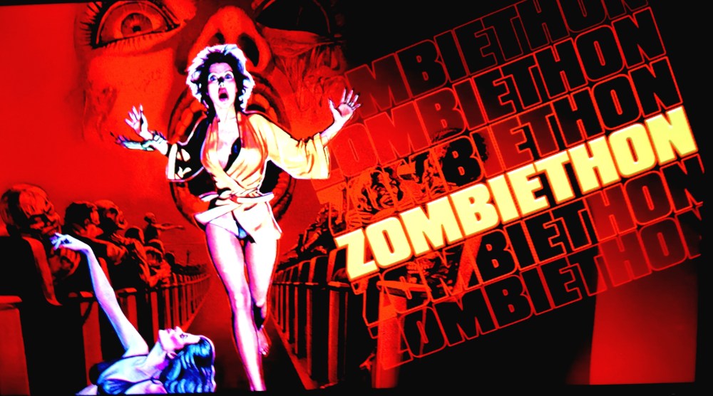 Zombiethon como su nombre indica, es una maratón de cine de zombies en el que se hace especial hincapié en la explotación italiana de la década de los setenta y ochenta principalmente. Para presentar el reportaje en cuestión, se nos presenta una historia de muertos vivientes bastante ingeniosa y bien realizada. Una mujer corre por un pueblo desierto huyendo de un resucitado. Su carrera, la lleva hasta un cine abandonado donde una horda de no muertos está disfrutando de un festín de sangre y vísceras, a través de una pantalla. La chica se sienta y será testigo junto al espectador, sobre títulos memorables de cintas clásicas de horror. Nuevo documental montado y dirigido por el realizador Ken Dixon, que ya tenía experiencia en este tipo de producciones.