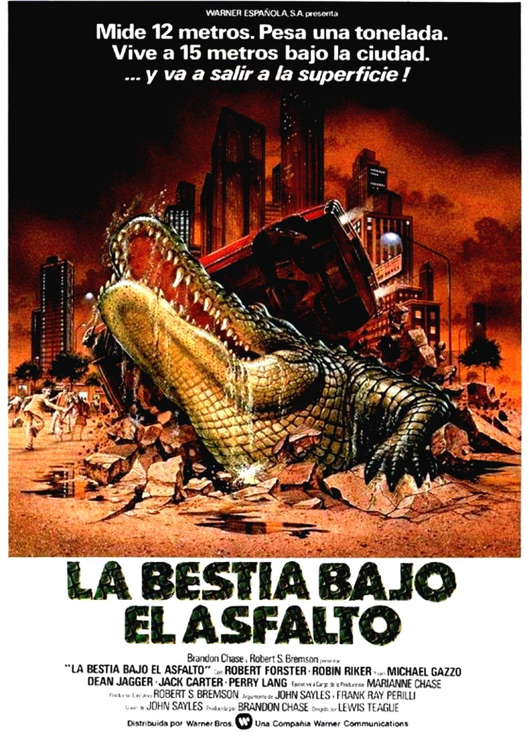 Lewis Teague dirigió La Bestia Bajo el Asfalto (Alligator, 1980) producción que podría erigirse como uno de los mejores títulos de terror animal de la década de los ochenta que sería posteriormente imitado hasta la saciedad. El realizador estuvo a cargo después de otros filmes de culto (en cuanto a género de horror se refiere) como la inolvidable Cujo (1983) basada en un relato de Stephen King o Los Ojos del Gato (1985) que era una antología de historias cuyo máximo exponente era la de un duendecillo malvado que se aparecía en la habitación de una niña. Esta cinta que nos ocupa se encuentra protagonizada por un excelente Robert Forster. La trama principal se centra en una leyenda urbana (supuestamente basada en hechos reales en su premisa argumental) sobre caimanes adquiridos como mascotas que eran arrojados por el váter e iban a parar a las alcantarillas de la ciudad, creciendo en dicho ecosistema. El resultado en la ficción era que el reptil crecía desmesuradamente y ataca en la jungla de asfalto. Y eso es lo que nos ofrece esta obra cinematográfica tremendamente entretenida que ningún fanático de este tipo de subgénero debe dejar pasar. De visionado obligado y con subtramas que enganchan más (fuera del cocodrilo devorador) como los problemas capilares del protagonista y sus romances eventuales.