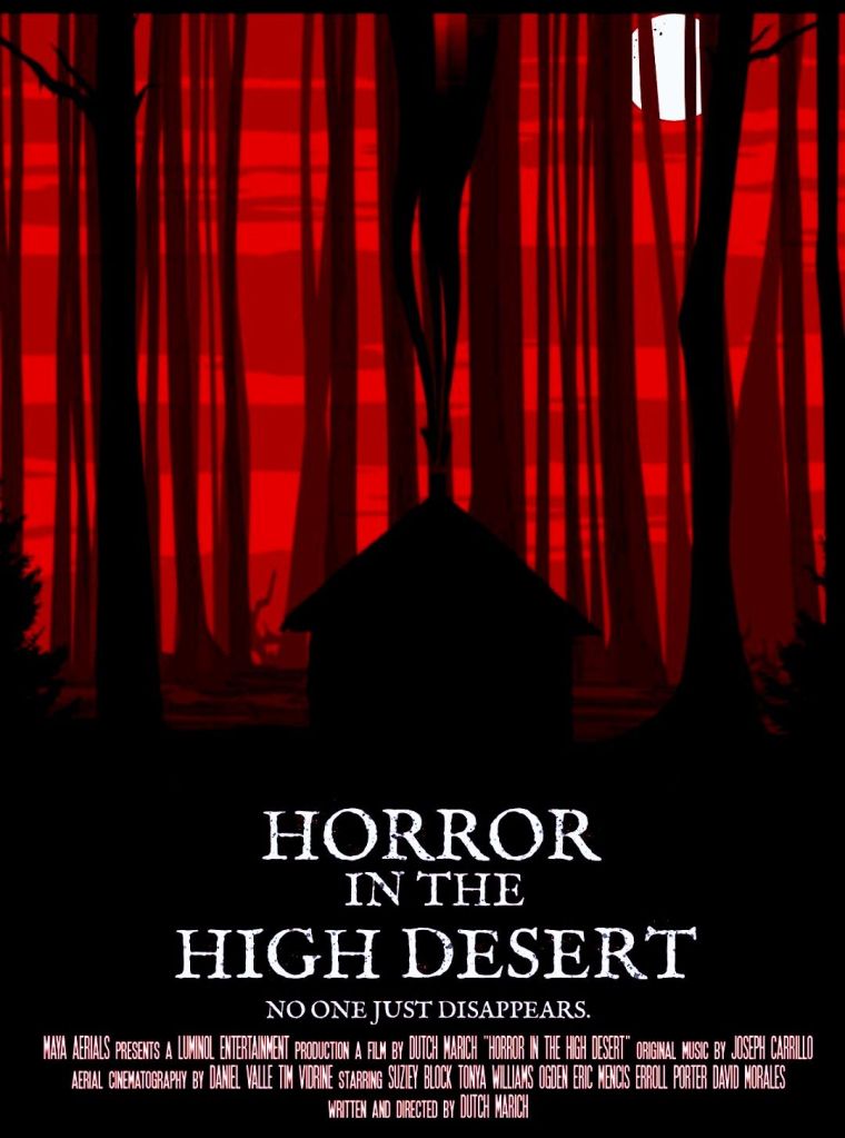 Horror in the High Desert (2021) es una película dirigida por Dutch Marich que se encuentra protagonizada por Errol Porter, David Morales y Eric Mencis entre otros. Cinta en clave de falso documental que nos cuenta la hipotética desaparición de Gary, un joven que marchó a hacer senderismo y nunca regresó. A través de entrevistas conoceremos su historia para así poder conducir al espectador hasta un siniestro desenlace. Bien realizada si gusta el formato y cuenta también con momentos aterradores como está mandado. Bastante recomendable.