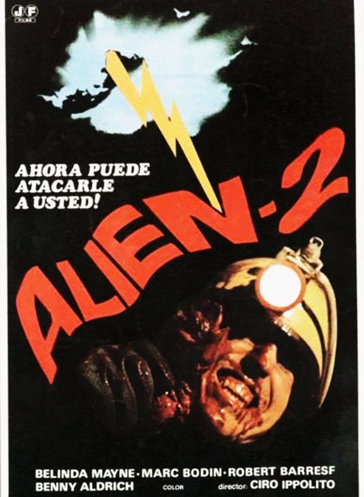 Alien 2: Sobre la Tierra (Alien 2: sulla Terra, 1980) es una película dirigida por Ciro Ippolito y Biagio Proietti que se encuentra protagonizada por Belinda Mayne, Marc Bodin y Michele Soavi entre otros. Falsa secuela de Alien que aprovechaba los tirones que tenían este tipo de cintas en los videoclubs de antaño y que es una Serie B descarada por los cuatro costados pero a su vez, una producción sumamente divertida. La trama nos cuenta como un grupo de jóvenes se adentran en una cueva donde una misteriosa criatura de origen extraterrestre comenzará a perseguirles sin tregua. El tema de sustituir el espacio por una caverna sombría es una proposición realmente imaginativa y refrescante, si se maneja un presupuesto ajustado. Además, la claustrofobia de estos lugares es una baza positiva para acrecentar la tensión en el espectador. Filme italiano que es ya todo un clásico de culto entre los fanáticos del género. Para recuperar y disfrutar sin revuelos.