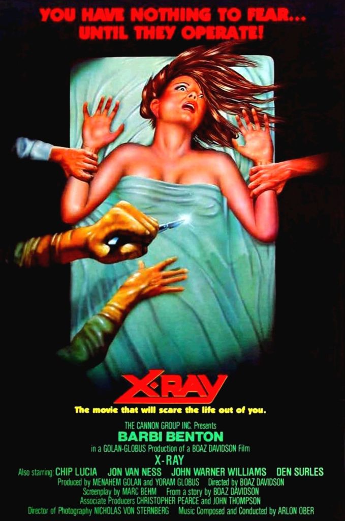 Rayos X (X-Ray, 1981) es una película dirigida por Boaz Davidson que se encuentra protagonizada por Barbi Benton, Jon Van Ness y Chip Lucia entre otros. La trama nos cuenta como una mujer es retenida en un hospital bajo un diagnóstico sospechoso. Todo ha sido obra de un psicópata con ansias de venganza contra ella. Ahora deberá luchar por sobrevivir a una pesadilla policlínica. El realizador de la legendaria comedia adolescente Polo de Limón (1978) llevó a cabo este slasher tan inquietante como acelerado que cuenta con momentos surrealistas y otros bastante más logrados. Si os dan pánico los sanatorios y o gustan las protagonistas sexy, este es vuestro filme ideal.