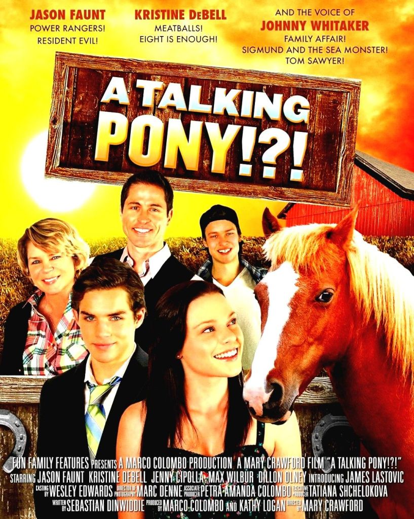 ¡Un pony que habla! (A talking Pony!, 2013) es una película dirigida por David DeCoteau (bajo el pseudónimo de Mary Crawford que utilizó en esta saga de producciones familiares donde se incluyen animales entrañables) que se encuentra protagonizada por Jason Faunt, Kristine DeBell y James Lastovic entre otros. La trama nos cuenta como una familia que va a ser expropiada de su propiedad, debe enfrentarse a esta nueva situación. Una serie de coincidencias inesperadas les hará ver una luz en su oscuro futuro. Cinta para todos los públicos que mezcla el drama con la comedia juvenil, algo que sucedía más en los años ochenta y noventa que en la actualidad. La verdad es que el filme es mejor de lo esperado y se puede disfrutar con toda la familia frente al televisor. La traba es que este tipo de historias con valores inocentes, carecen totalmente de interés hoy día y así nos va. Si quieren pasar un rato entretenido con un pony parlante pues ya saben y si no, pasen de largo.