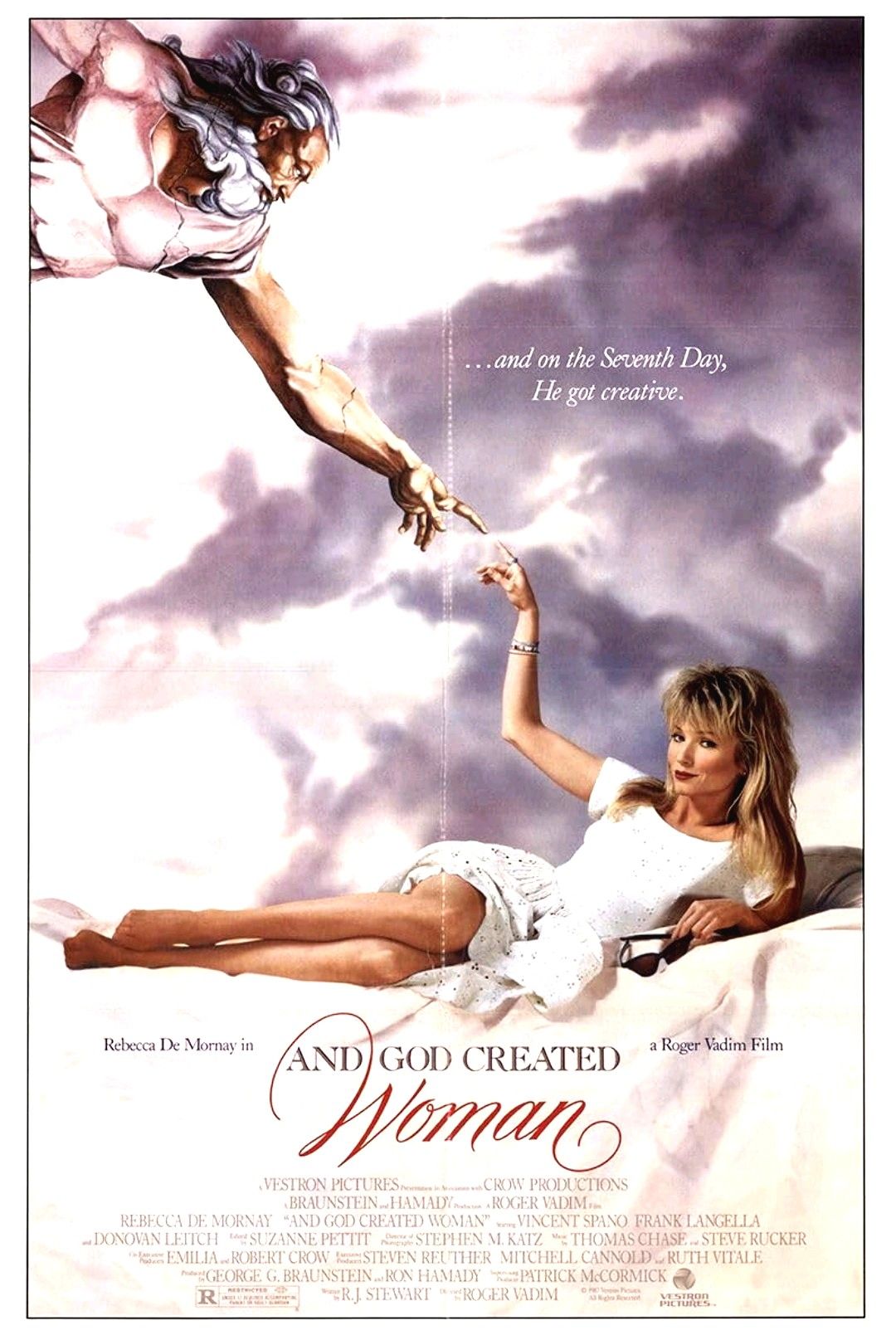 And God Created Woman (Y la creó para el escándalo, 1988) es una película dirigida por Roger Vadim que se encuentra protagonizada por Rebecca De Mornay, Vincent Spano, Frank Langella, Donovan Leitch y Jamie McEnnan entre otros. La trama nos cuenta como una mujer se presta a un matrimonio de conveniencia para poder salir de prisión. Un hombre con poder anda detrás de todo esto. El realizador de la mítica Barbarella (1968) y el filme de 1956 con el mismo título que este, presenta este reboot con un nuevo triangulo amoroso y una estética más acorde a la década en la que este fue rodado. El resultado es irregular cuanto menos y las escenas eróticas están bastante metidas con calzador pero su visionado no resulta desagradable, ni mucho menos. Como diversión liviana pues no está mal y probablemente queda reservada a los fans de ese añorado decenio.