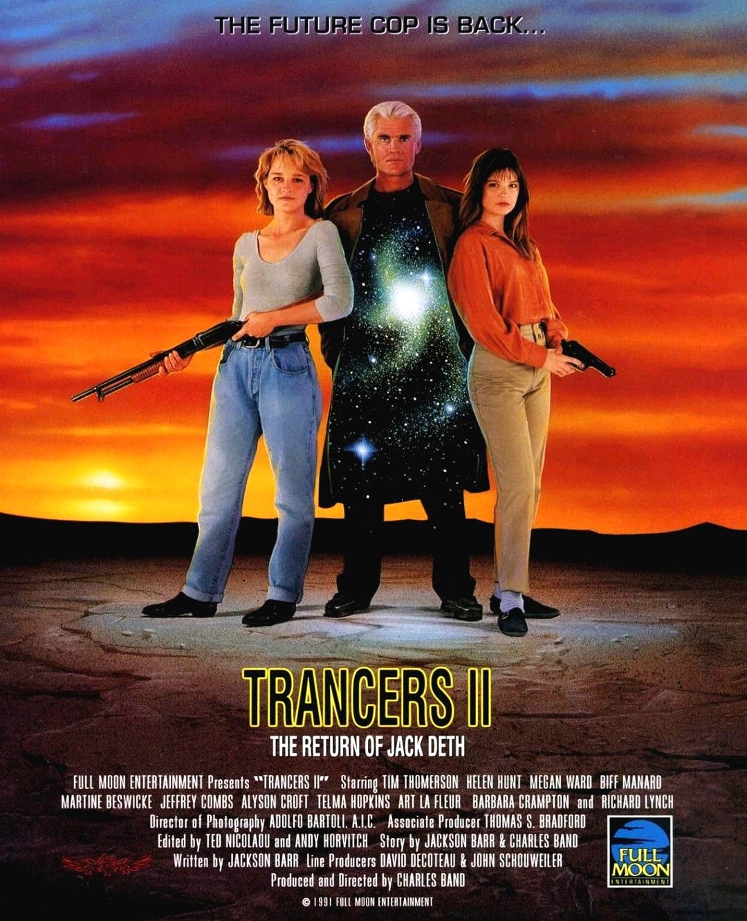 Trancers 2 (1991) es una película dirigida por Charles Band que se encuentra protagonizada por Tim Thomerson, Helen Hunt, Jeffrey Combs, Richard Lynch y Barbara Crampton entre otros. La trama nos cuenta como un investigador del futuro que ha decidido vivir su vida en una época distinta a la suya, tendrá que enfrentarse de nuevo a una antigua amenaza que ya creía olvidada. Secuela del éxito de videoclub de los años ochenta, Trancers. Repiten los actores principales, respaldados por unos secundarios de lujo. En esta ocasión, la historia queda algo más floja, ya que se centran demasiado en los líos amorosos del personaje principal, Jack Deth. De resto, queda una segunda parte bastante decente y entretenida, si más no. Recomendada a los admiradores incondicionales de la entrega original y a los fanáticos de la Serie B de ciencia ficción más casposa.